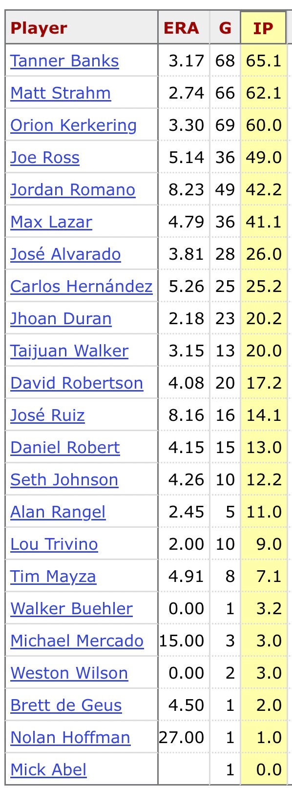 Using the same methodology that we used for the rest of the team, we can split the bullpen’s overall ERA into two pieces: a weighted 4.97 ERA for the 34% of the bullpen’s 511 IP that departed (primarily in the form of Matt Strahm, Joe Ross, Jordan Romano, and David Robertson), and a weighted 3.91 ERA for the remaining 66%.