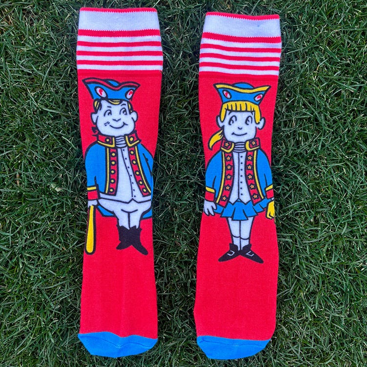 It’s a good bet that they were designed with the 1976 bicentennial celebration in mind, and it’s nice to see them dusted off for 2026. Show Phil and Phillis some love with these socks before they go back in their cages for another 50 years.