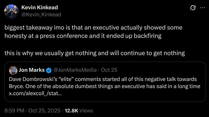 Harper didn’t need to escalate the situation. And let’s be extremely clear: Dave Dombrowski did not say a single word about trading Bryce Harper. Harper seems to be leaning into perceived criticism and speculation. Why not brush Dombrowski’s comments aside?